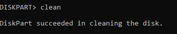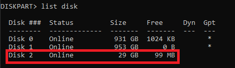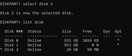 Make sure you identify the disk number correctly as the subsequent operations will erase all of the partitions on the disk.